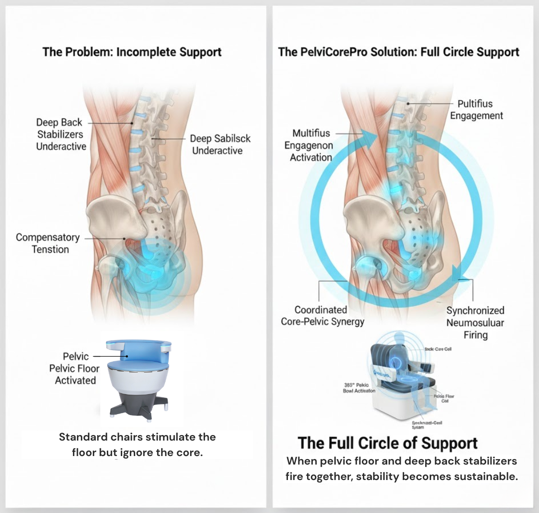 Standard chairs hit the pelvic floor but leave the back unsupported—an incomplete fix.